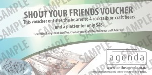 This voucher entitles the bearer to 4 cocktails or craft beers and a platter for $45.